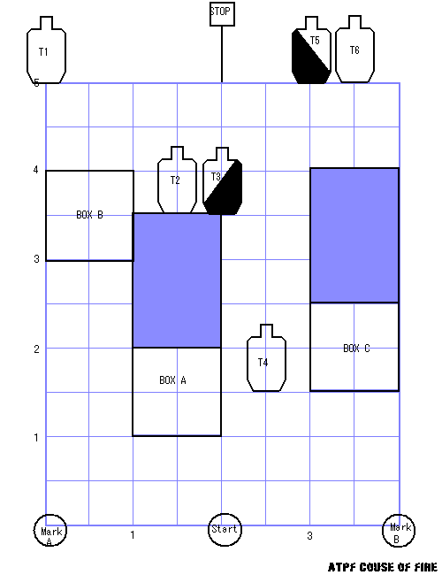 ★手順:スタート合図→ガンを拾い任意の位置で、ペーパーターゲットに2発つづ、ストップターゲットに1発ヒットする。ただし、必ずそれぞれのBox内では、ストップターゲット以外、1個以上のターゲットをヒットしなくてはならない。BoxA、Cでは左右どちらバリケードスタイルIDPA部門は、任意の位置で、スピードリロードもしくは、タクティカルリロード。