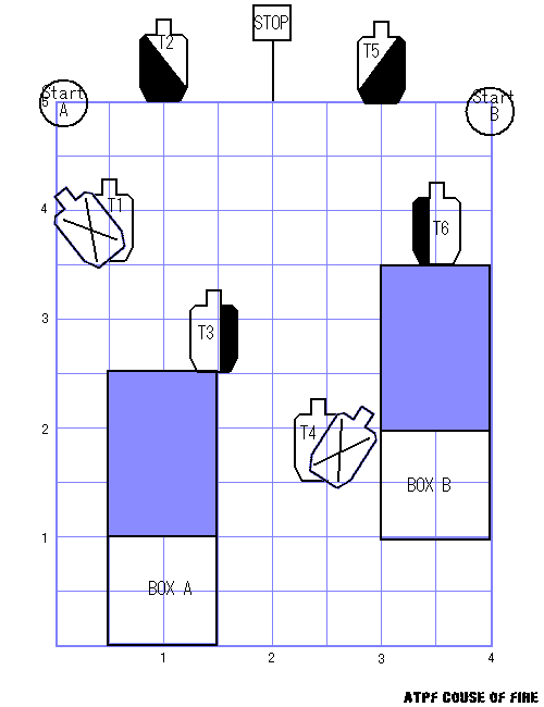 ★手順:スタート合図→任意の位置で、ペーパーターゲットに2発つづ、ストップターゲットに1発ヒットする。ただし、必ずそれぞれのBox内では、ストッププレート以外1個以上のターゲットをヒットしなくてはならない。BoxA、Bでは左右どちらバリケードスタイルIDPA部門は、任意の位置で、スピードリロードもしくは、タクティカルリロード。