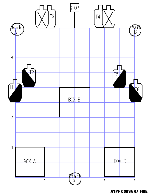 ★手順:スタート合図→マークに置いたガンを拾いロードする→任意の位置で、ペーパーターゲットに2発つづ、ストップターゲットに1発ヒットする。ただし、必ずそれぞれのBox内では、ストップターゲット以外1個以上のターゲットをヒットしなくてはならない。IDPA部門は、任意の位置で、スピードリロードもしくは、タクティカルリロード。
